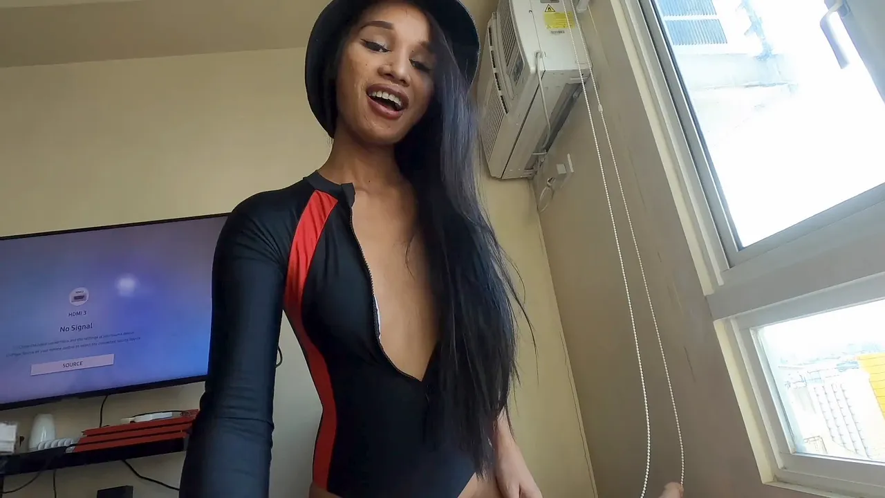 Die zierliche exotische Ladyboy Juney hat Spaß mit seinem Schwanz